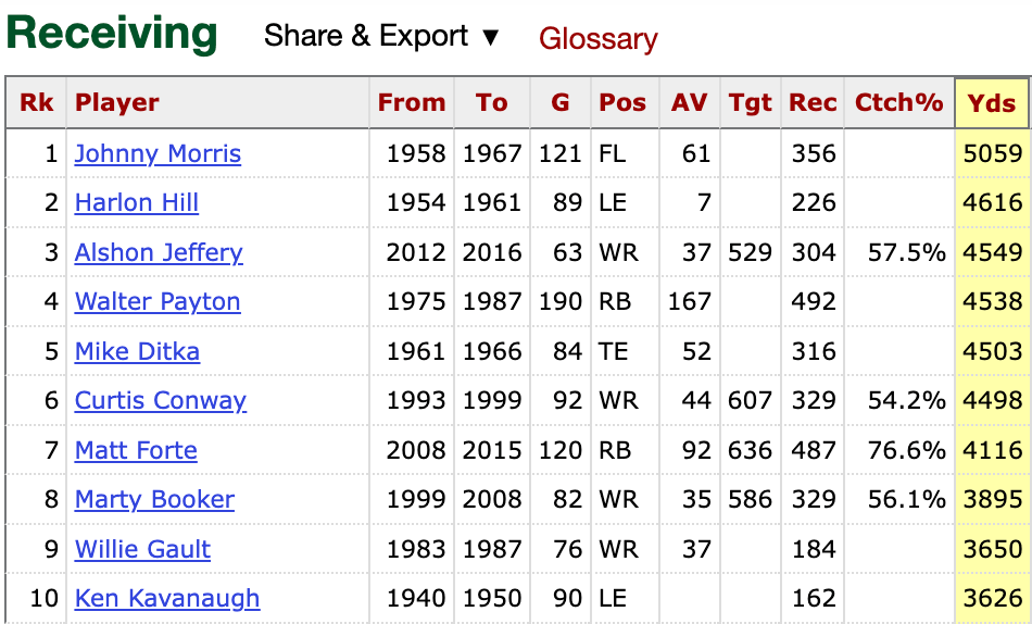 But they have done next to nothing through the years to actually help their QBs succeed. I’m not going to go into a list of every team in the league to compare the Bears’ historical wide receivers to other teams, but let me just leave you with this list of the receiving yard leaders in franchise history, and you tell me if it looks like the Bears have come anywhere close to putting their QBs in position to succeed: