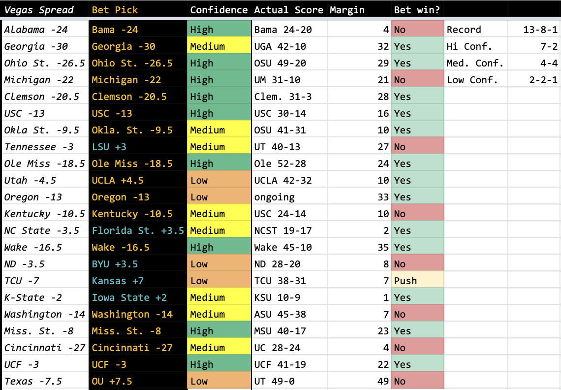 22 picks–all the top-25 teams in action plus the Texas/OU game, and the Wednesday night UCF/SMU game–with an overall record of 13-8-1. That’s a 59% win rate, 62% if you exclude the push.