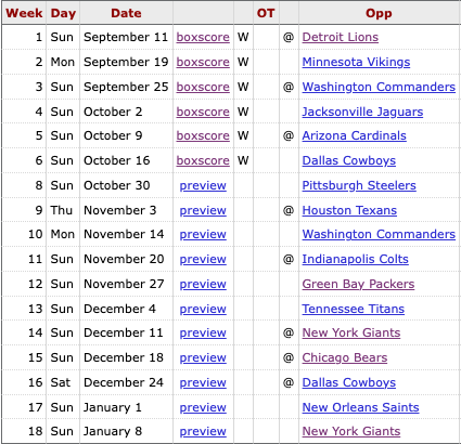 Steelers should be a win, Texans should be a win, Commanders should be a win. That’s 9-0. At Colts will be tough, but Philly should be favored. Packers at home should be a win, Titans at home won’t be easy but Philly will be favored. They could definitely get to 11-0.