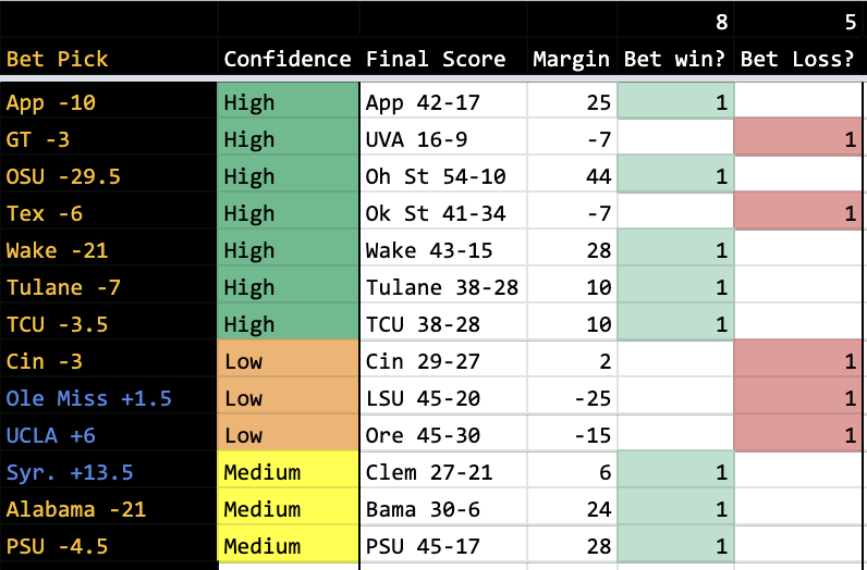5-2 in the high confidence picks, 3-0 in the medium confidence picks, and then 0-3 in the low confidence picks.