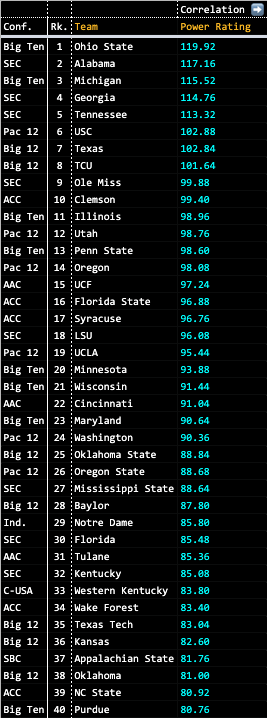 The power ratings advise staying away from that 15 point line in the Ohio State vs. Penn State game. I have Penn State losing that game by about 14, which is too close for comfort compared to the line.