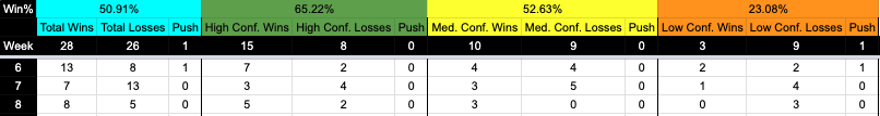 However, if you took only the high confidence picks, you’d have gone 15-8, a 65% win rate.