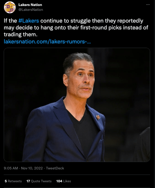 They’re not going to make a move. This is the Lakers roster for the entire season. The team is 2-9, so they can say, “Why would we give up our picks to improve a team that has no chance either way?”