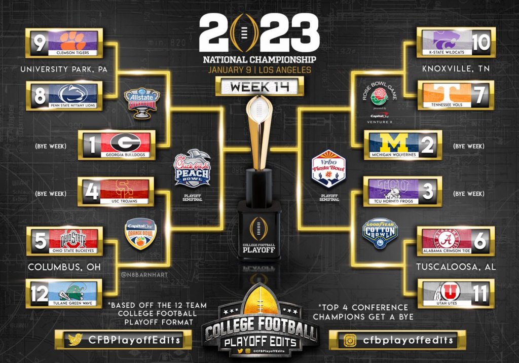 The first round games are all played on campus, which is a really interesting dynamic here. You’d have Tulane at Ohio State, Utah at Alabama, Kansas State at Tennessee, and then Clemson at Penn State. This could get very interesting as these games are going to be played in mid/late December. Going up to Happy Valley in Pennsylvania in the middle of December is something Clemson, for example, would really want to avoid.