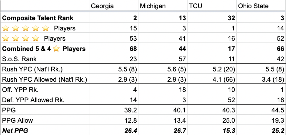 However, as you can see from the statistical table above, TCU is well below the other three teams in virtually every major category. They are a distant 32nd in overall roster talent. They only have 17 players on their roster who were either 5 or 4 star recruits, compared to 68 for Georgia, 66 for Ohio State and 44 for Michigan. For reference, there are typically 80-85 players on a college football roster. 85 is a full roster, but some teams are below that for whatever reason (e.g., new coach comes in and lots of players transfer out, several walk-ons not on scholarship, etc.)