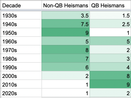 We can see the rise of quarterback-centric football begin in the 2000s with the players that won the Heisman Trophy. Clearly something changed in the early 2000s that shifted college football into the quarterback-driven sport we know today.