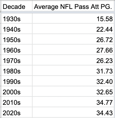 Passing was growing increasingly popular starting in the 1930s (the numbers only go back to 1932), and you can see a steady increase from the 1930s to the 1940s, and then from the 1940s to the 1950s, but then from the 1950s through the 1970s, pass attempts per game plateaued around 26-27.