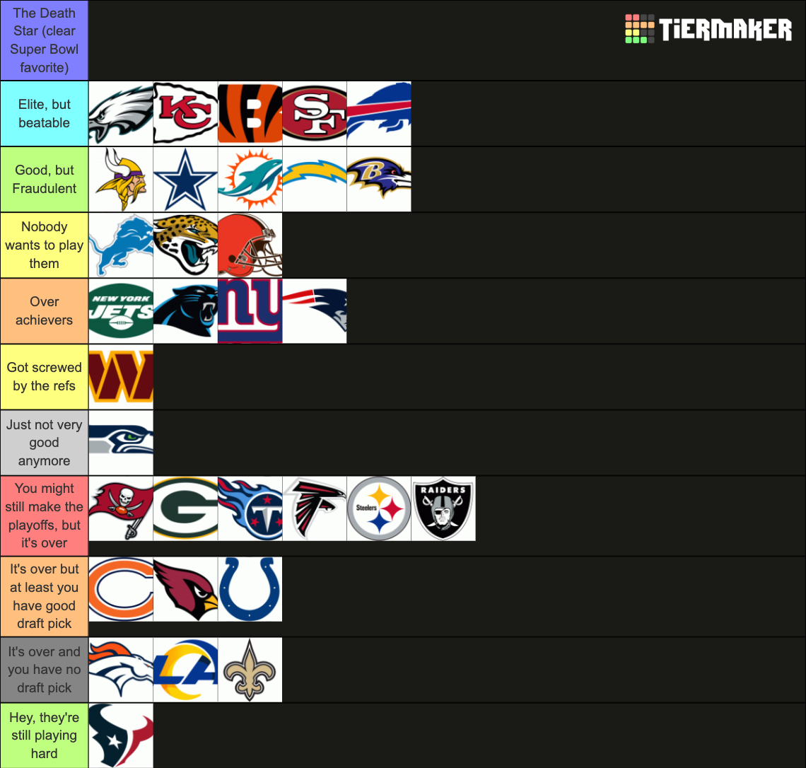 But here’s the thing: it feels like this season is missing that one team that defines the season, you know? Like that one team that becomes the main storyline. It was the Bills at first, but then they lost a few games and no longer feel like a Death Star.