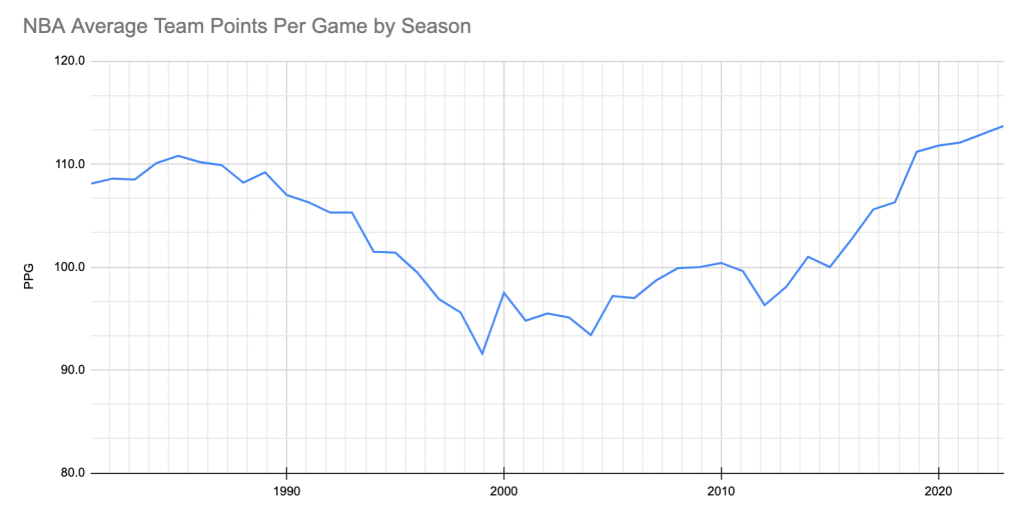 Scoring in the NBA has waxed and waned over the years. It was high during the 80s, then started falling all throughout the 90s, bottomed out in the early-mid 2000s, and then started rising in the early-mid 2010s.