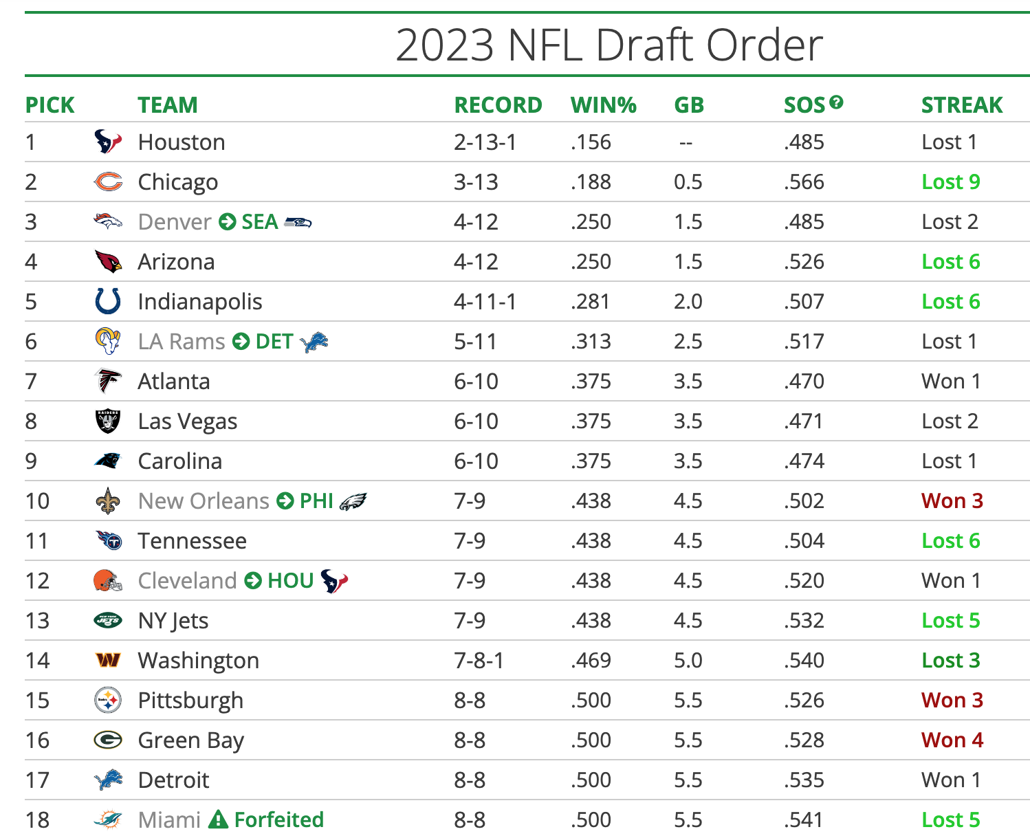 If Houston beats Indy this weekend, then the Bears will get the number one pick. We’re assuming the Bears will lose because Justin Fields isn’t playing and they’re going up against the Vikings. We’re also going to assume the Cardinals will lose to the 49ers this weekend because the 49ers have playoff seeding to play for, and the Cardinals want to lose to improve their draft position.