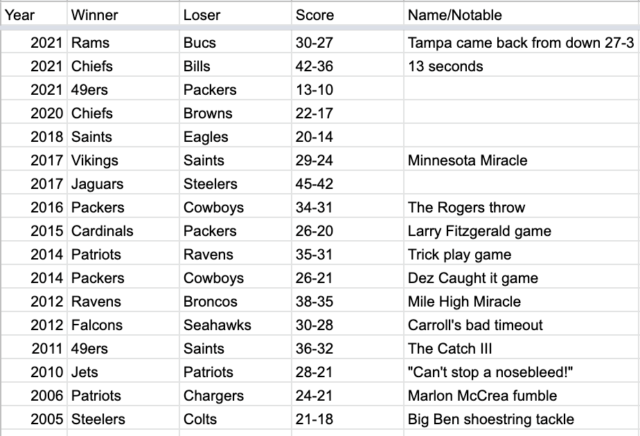In just last year’s divisional round, we had the 49ers beating the Packers in Lambeau 13-10, we had the Rams nearly blowing a 27-3 lead to Tampa, we had that unforgettable game between the Bills and Chiefs where the Chiefs were able to tie it up with just 13 seconds in regulation. We also had that Titans vs. Bengals game where Tennessee sacked Burrow 9 times but Cincy still won.