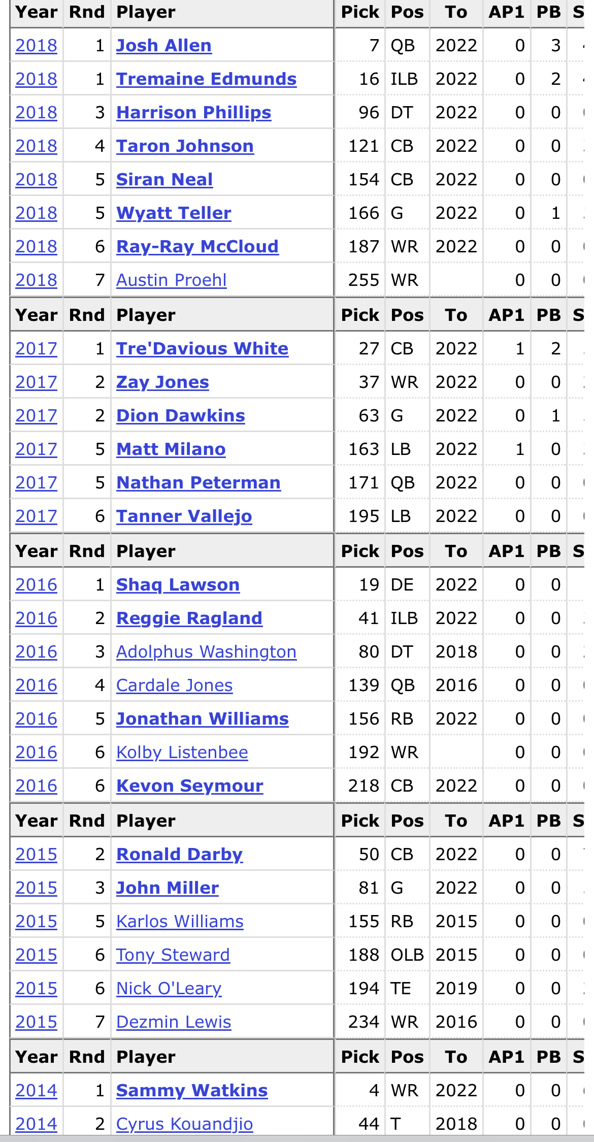 The tough part about Buffalo taking Watkins that high in 2014 was that Mike Evans went at pick 7, Odell Beckham went at pick 12, and Brandin Cooks was pick 20. That’s got to sting if you’re Buffalo.