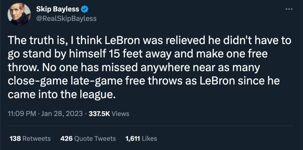 LeBron has won two Finals Game 7s at the free throw line, yet Skip thinks LeBron is afraid to go to the free throw line at the end of a regular season game in January in year 20 of his career? Makes absolutely zero sense, but that’s LeBron haters for you.