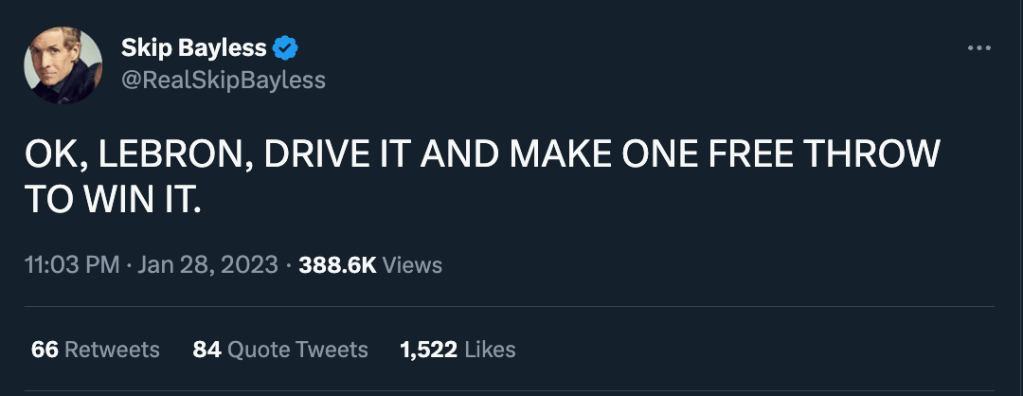 To lighten the mood, let’s take a look at Skip Bayless’ Twitter timeline. He tweeted this right after Jaylen Brown tied it up and there were 6 seconds left in the game, Laker ball: