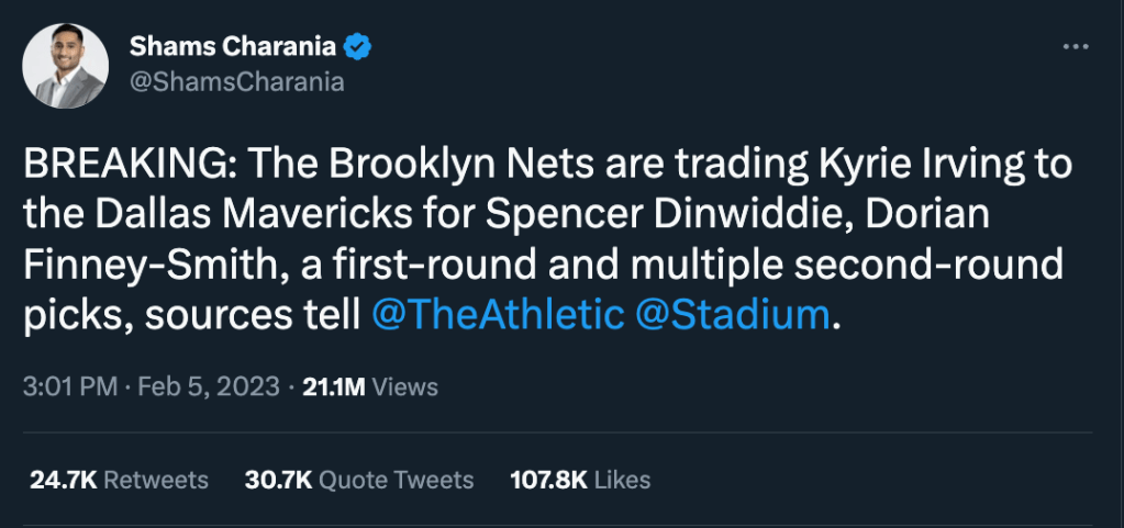 So Kyrie apparently told the Nets: either trade me by the deadline and get something in return, or I walk in free agency in the summer. However, complicating this whole plan of this is the fact that the Nets are actually pretty good this year. They’re 31-20 right now, 4th place in the East, and Kevin Durant should be coming back in the next couple of weeks. Probably right after the All Star break if I had to guess.