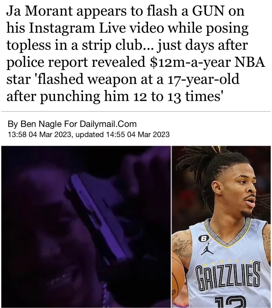 On Friday, the Grizzlies played the Nuggets in Denver. Denver won the game 113-97. Then, after the game, Morant apparently went out to a strip club in Denver, where he then went live on Instagram in the wee hours of the morning, at one point flashing a gun in front of the camera. And that was when he really crossed a line.