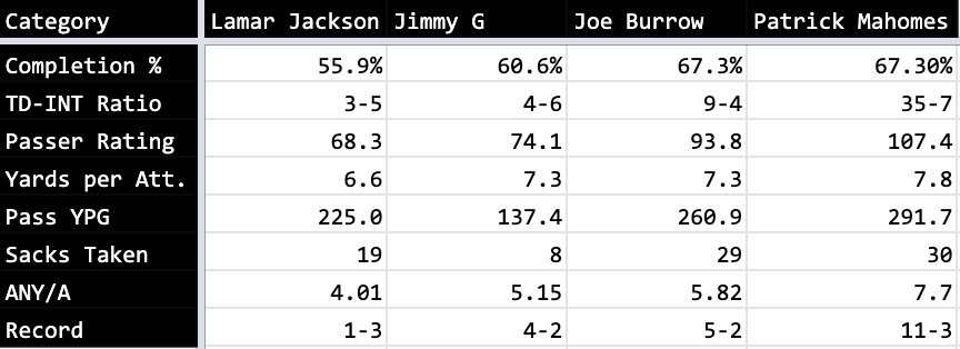 When you compare Lamar’s playoff numbers to other quarterbacks, it’s not pretty. On this chart, I’ve included Lamar, as well as Joe Burrow and Patrick Mahomes just so you can see what elite-level playoff QB play looks like. But I’ve also included Jimmy Garoppolo, because believe it or not, Jimmy G’s numbers in the playoffs are better than Lamar’s: