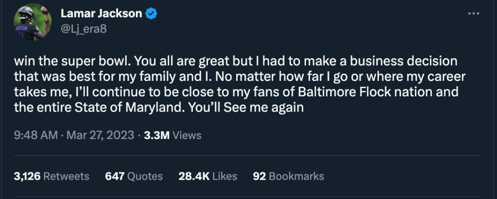 If Lamar’s goal is to play football and make generational money in the process, he’s coming very close to failing at both. If he sits out when push comes to shove, then he will not be playing football, and he will not be making generational money.
