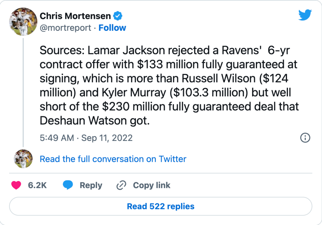 - Does Lamar think the Ravens are the only team out there not willing to offer him a fully guaranteed 5-year contract? He has to know by now that other teams aren’t lining up to offer him that DeShaun Watson contract.