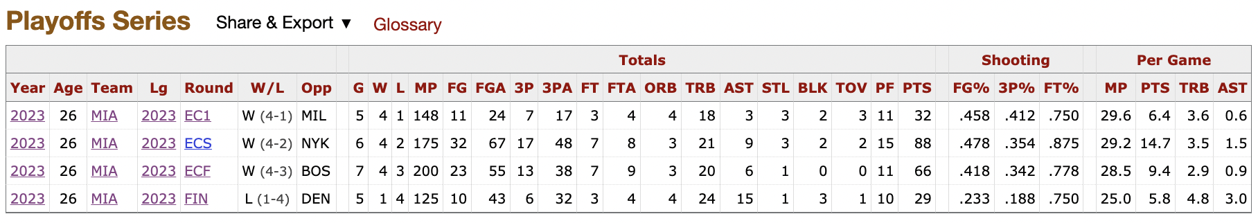 Look at Caleb Martin, too. He was phenomenal against Boston–his numbers were clearly and undeniably better than Jaylen Brown’s in the series. But against Denver, he was horrific:
