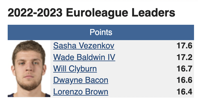 In the EuroLeague–again, not the league Wemby played in, but the top league in all Europe–the league leader in points per game this past season was a guy named Sasha Vezenkov, who averaged…. care to take a guess?
