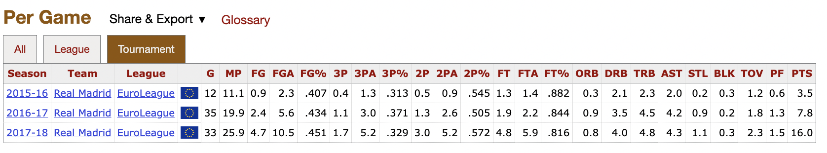 Luka first played in the EuroLeague when he was 16 years old, the youngest in his club Real Madrid’s history, and stayed there for three years before going to the NBA. He started out barely getting minutes but then slowly worked his way up into a prominent role. These are Luka’s EuroLeague numbers: