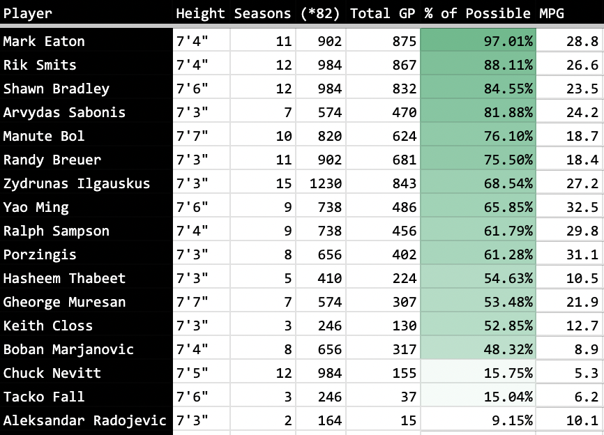 Update: Just to underscore how serious the injury risk is with Wemby, I’m going to share a little table that I scrapped together that shows just how injury prone the tallest players in NBA history have been. I used this Wikipedia page which lists a grand total of 29 players in NBA history who were 7’3″ or taller. Wemby is one of them, so already we are in some rarefied air. I slimmed down the list a little bit, omitting some of the guys who didn’t play much in the NBA (for example, Sim Bhullar, Slavko Vranes, Pavel Podkozin, Priest Lauderdale and several others), and just did a comparison of games played vs. total games they could’ve played to get an idea of how available these guys actually were.
