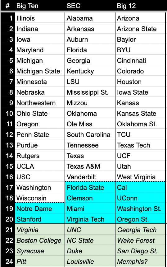 So that would give us three 20-team conferences with 11 schools homeless. I would assume that those 11 schools plus a one other (maybe Memphis?) could be equally distributed among the three remaining conferences to put them all at 24 schools.