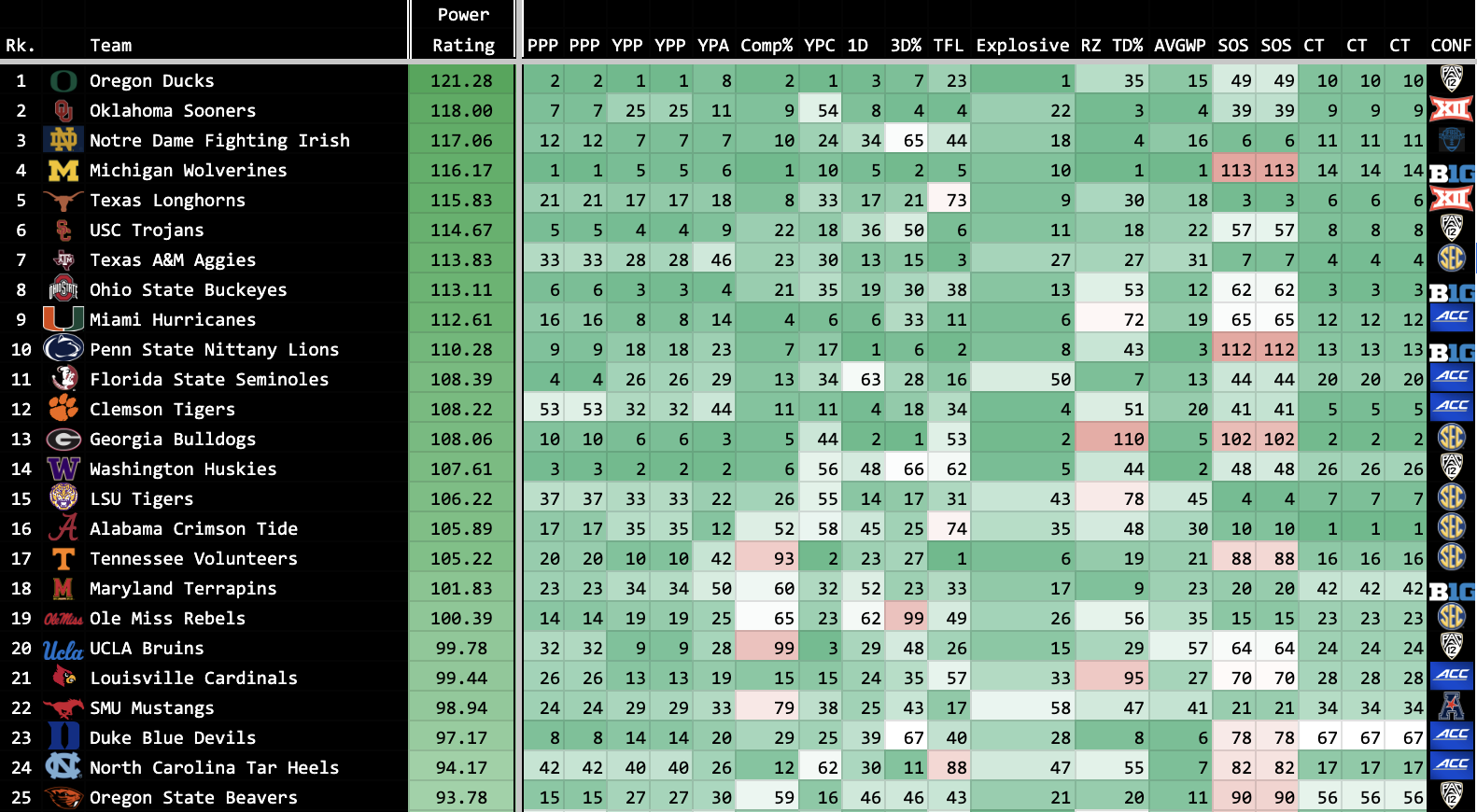 Oregon moves up to #1 in the country, leapfrogging Oklahoma. But Oregon lost! Yes, but they were statistically dominant and the ratings don’t care about record.
