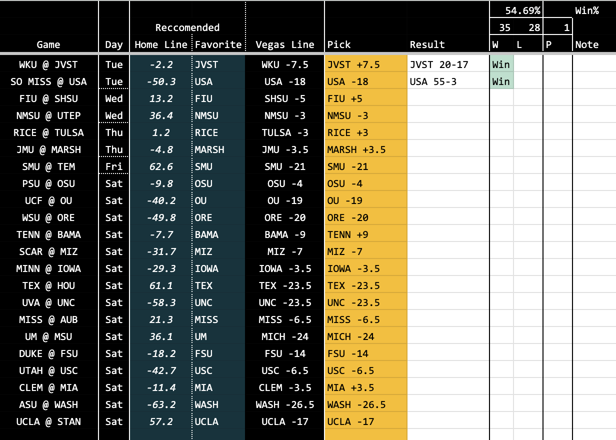 If you exclude the Miami-UNC game, which in view was a “stay away” game because I was unsure how mentally screwed up Miami would be after that Georgia Tech game, I’m sitting at about 55.6% on the season. And if FIU holds on and covers this +5 against Sam Houston (it’s 10-7 FIU right now), that would put me over 56%.