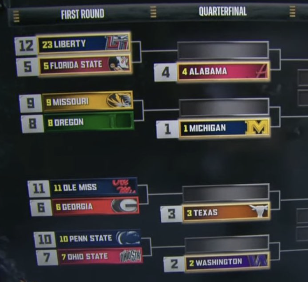 - But we’re getting distracted from the real issue here; They should’ve expanded the playoff to 12 teams this year. There are four really good teams that are left out this year: Georgia, FSU, Ohio State, Oregon. Plus you have teams like Missouri and Oklahoma and LSU that would be worthy in a 12 team playoff.