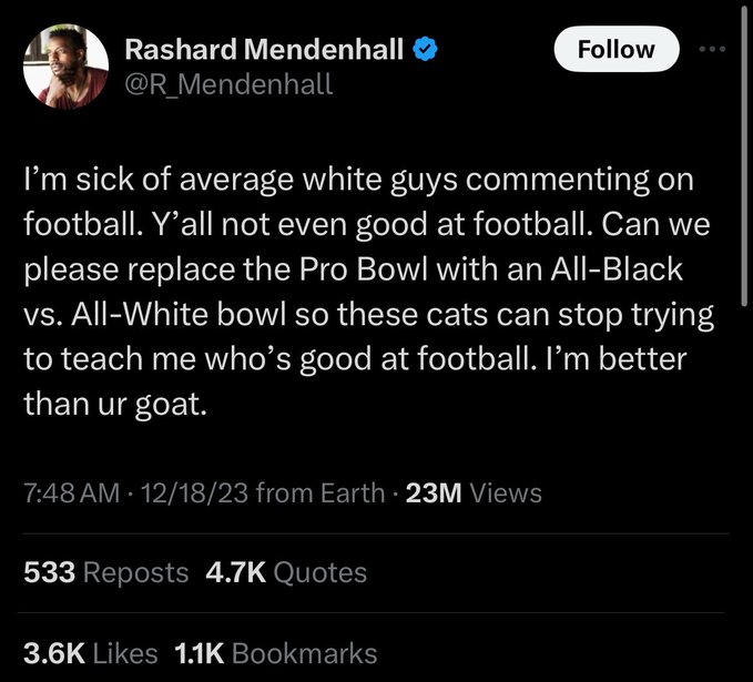 Let’s just get past the obvious racism here. A lot of people are hung up on that part, but I think that misses the mark: it seems like Mendenhall’s comment came from a place of resentment, possibly even deep-seated resentment, but it’s not like this is a mainstream viewpoint by any stretch. And the guy probably has CTE so cut him some slack.